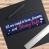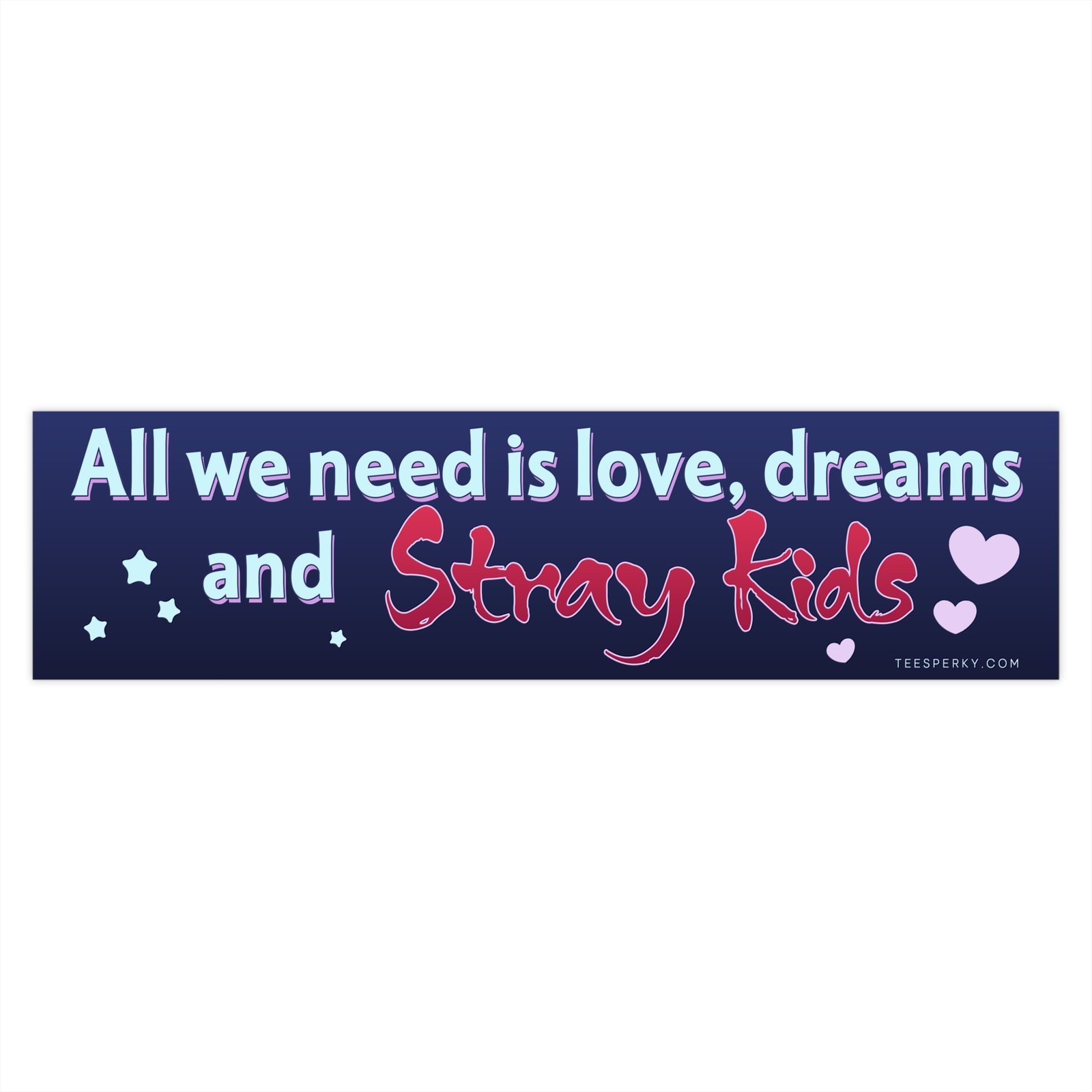 Express your passion with this “All We Need Is Love, Dreams and Stray Kids” bumper sticker. Perfect for K-pop fans, STAYs, and anyone inspired by Stray Kids’ music and message. Decorate your car, laptop, or notebook with this durable, weatherproof vinyl decal. A great gift for fans who believe in love, dreams, and positivity. Show your support for your favorite band and spread good vibes everywhere you go — ideal for concerts, fan meets, or everyday style.