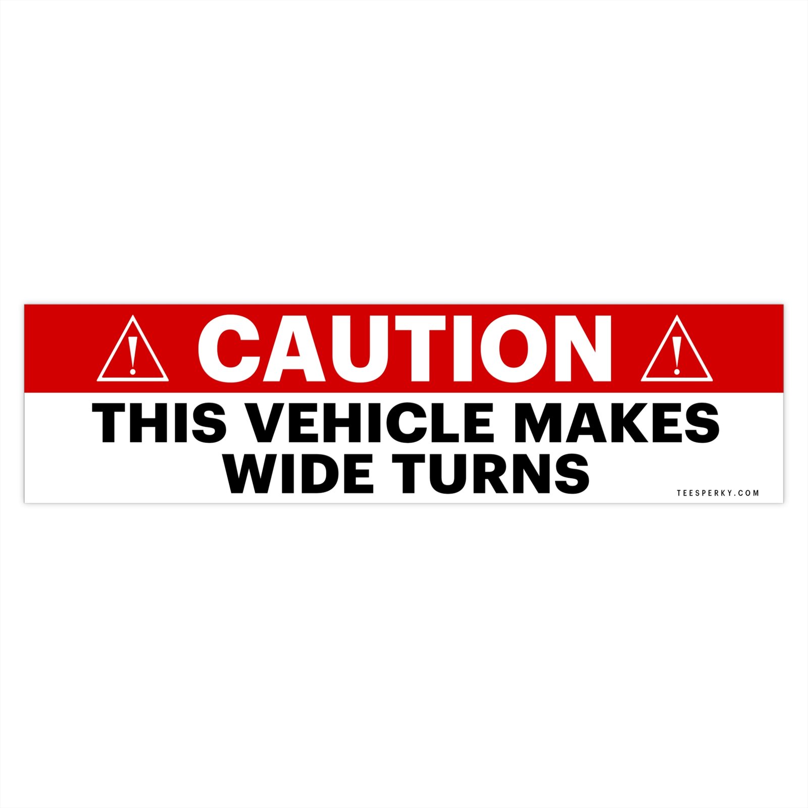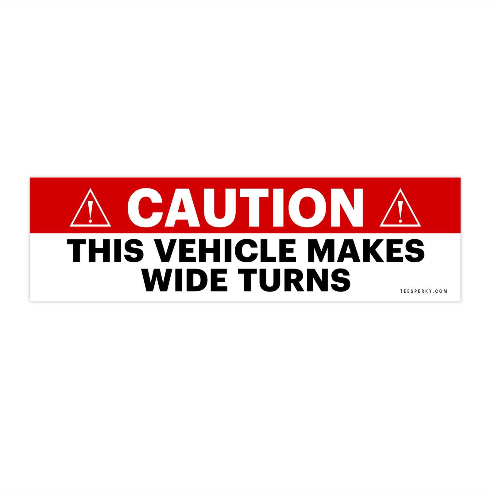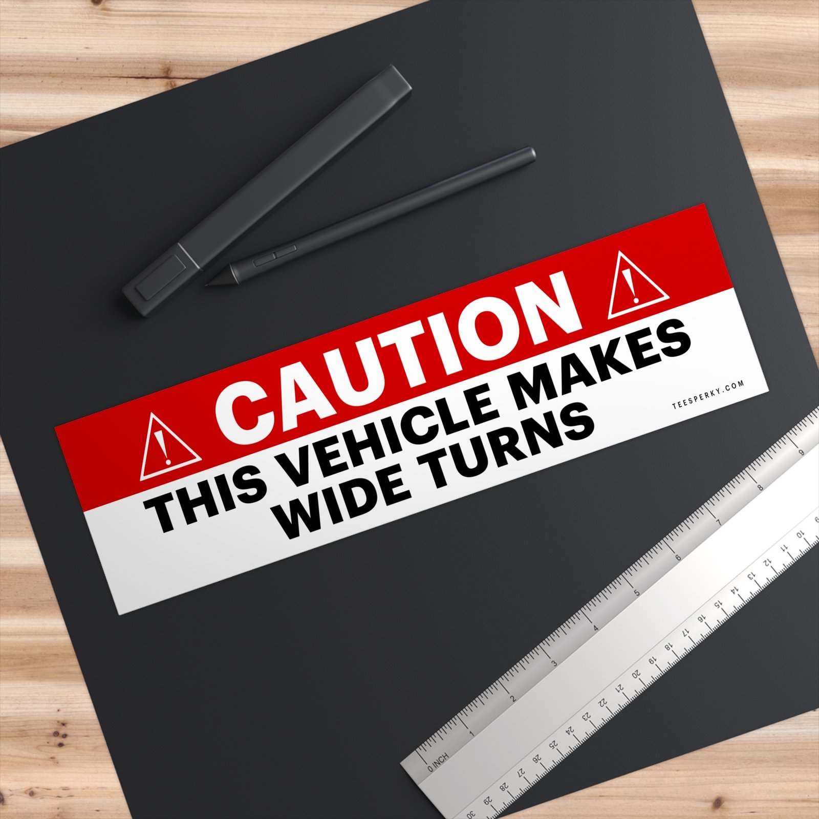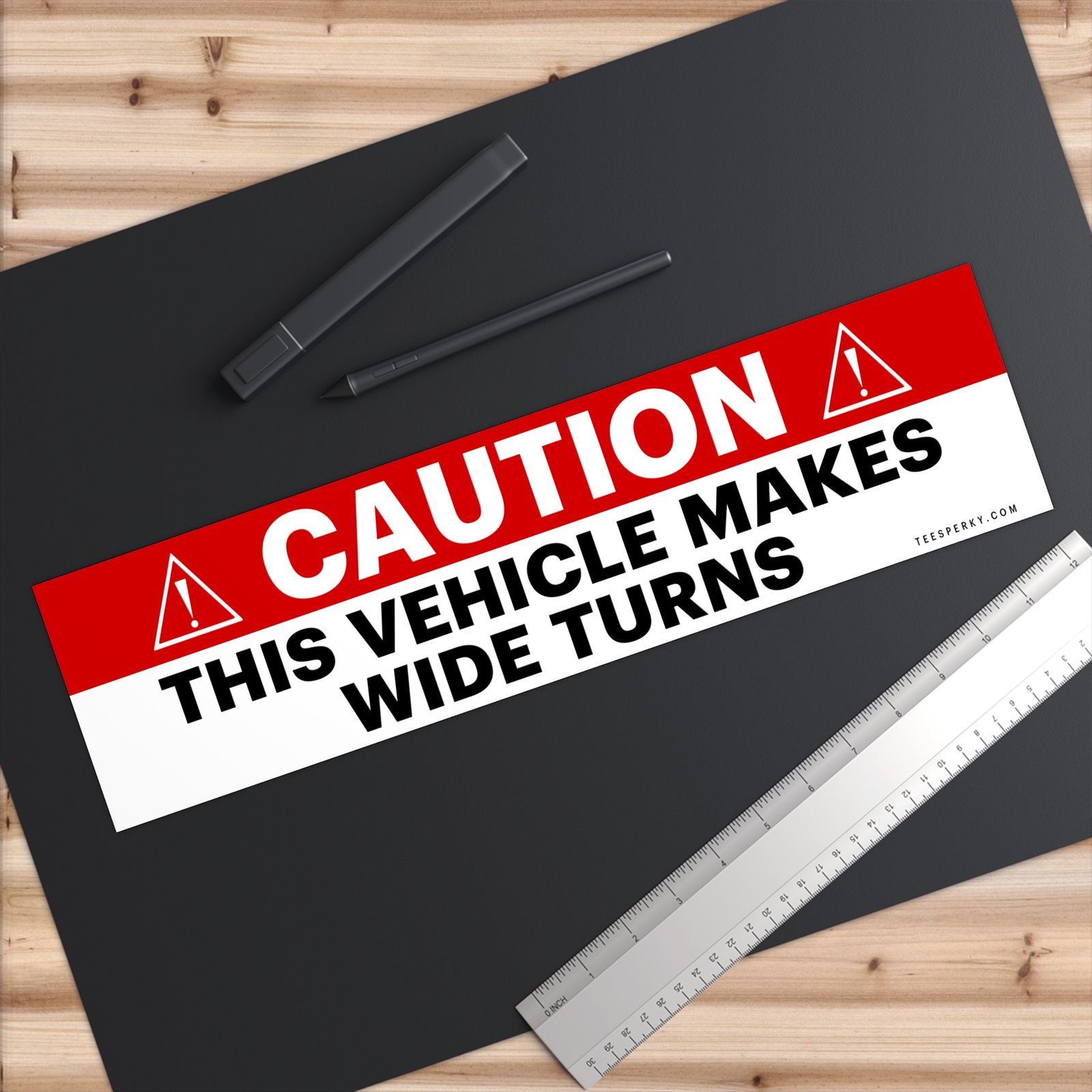 Caution This Vehicle Makes Wide Turns bumper sticker is a durable vinyl safety decal for trucks, trailers, buses, RVs, vans, and large vehicles. High-visibility warning sticker ensures road safety by alerting drivers to wide turns. Perfect for commercial fleets, semi-trucks, delivery vans, and construction vehicles. Waterproof, weatherproof, easy to apply, and long-lasting. Essential vehicle safety accessory for professional drivers, fleet managers, and anyone operating wide-turn vehicles.