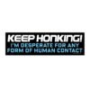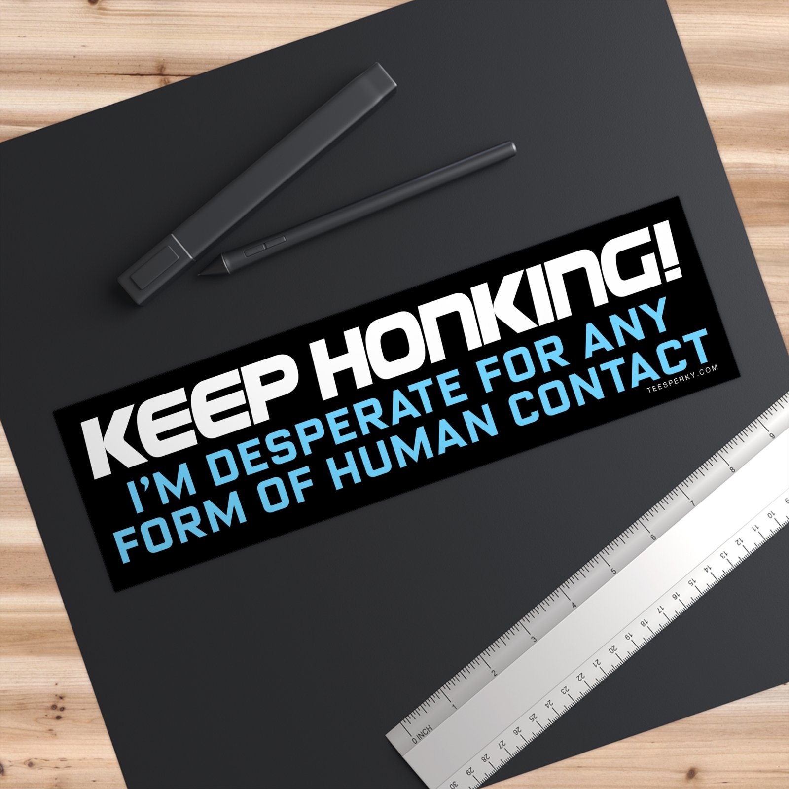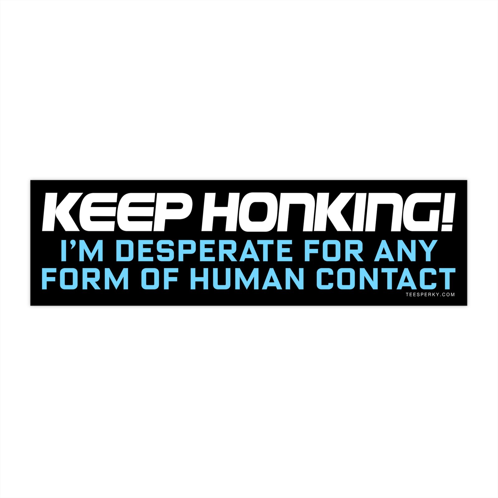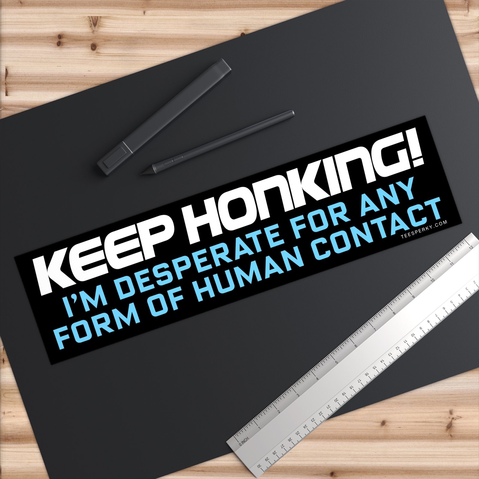 This funny bumper sticker features the phrase “Keep Honking! I’m Desperate for Any Form of Human Contact,” making it a perfect humor car sticker for drivers who love sarcasm, irony, and relatable jokes. A great conversation-starter sticker for cars, trucks, and laptops.