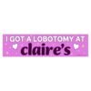Make a bold, dark-humor statement with the “I Got a Lobotomy at Claire’s” bumper sticker. Perfect for fans of ironic jokes, edgy humor, mall culture satire, and alternative comedy. This funny vinyl bumper sticker is great for cars, laptops, water bottles, skateboards, and notebooks. A unique gift for lovers of sarcastic quotes, internet humor, pop culture jokes, and rebellious sticker art. Durable, weatherproof vinyl designed to last indoors or outdoors.