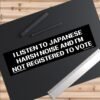 “I Listen to Japanese Harsh Noise and I’m Not Registered to Vote” bumper sticker is a bold, funny, and edgy design for cars, laptops, or walls. Perfect for noise music fans, harsh noise lovers, experimental music enthusiasts, and political humor collectors. Durable vinyl sticker with strong adhesive, great gift for underground music fans, punk rockers, nonconformists, and counterculture communities. Unique gag gift, novelty decal, and conversation starter for anyone who loves Japanese harsh noise and anti-establishment humor.