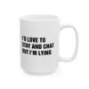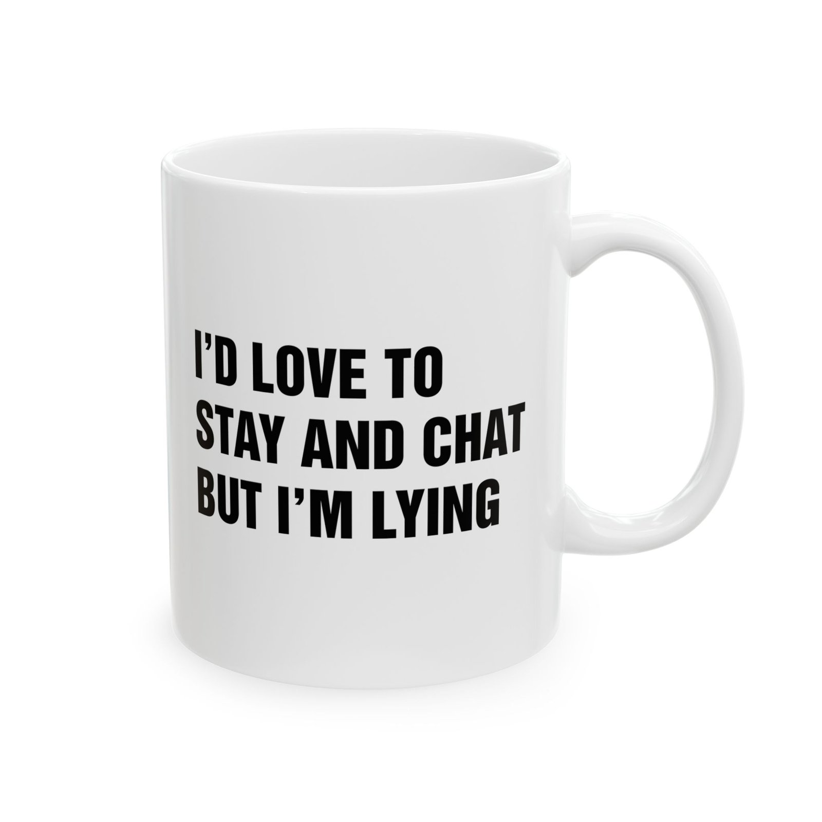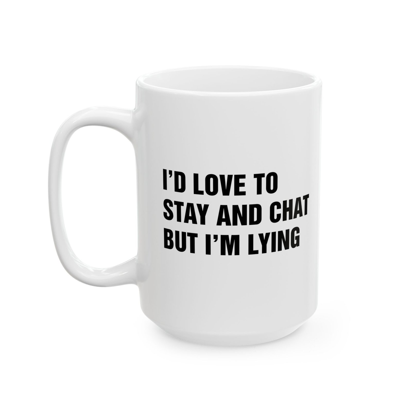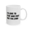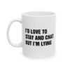 Funny “I’d Love to Stay and Chat But I’m Lying” coffee mug is the perfect sarcastic gift for friends, coworkers, and family. This novelty ceramic mug makes a hilarious office gift, gag gift, or birthday present for anyone who loves humor, sarcasm, and witty quotes. Great for coffee, tea, or hot chocolate, this durable dishwasher-safe mug is ideal for home, office, or dorm. Perfect for coffee lovers, sarcastic humor fans, and anyone who enjoys unique, funny, and bold statement mugs.