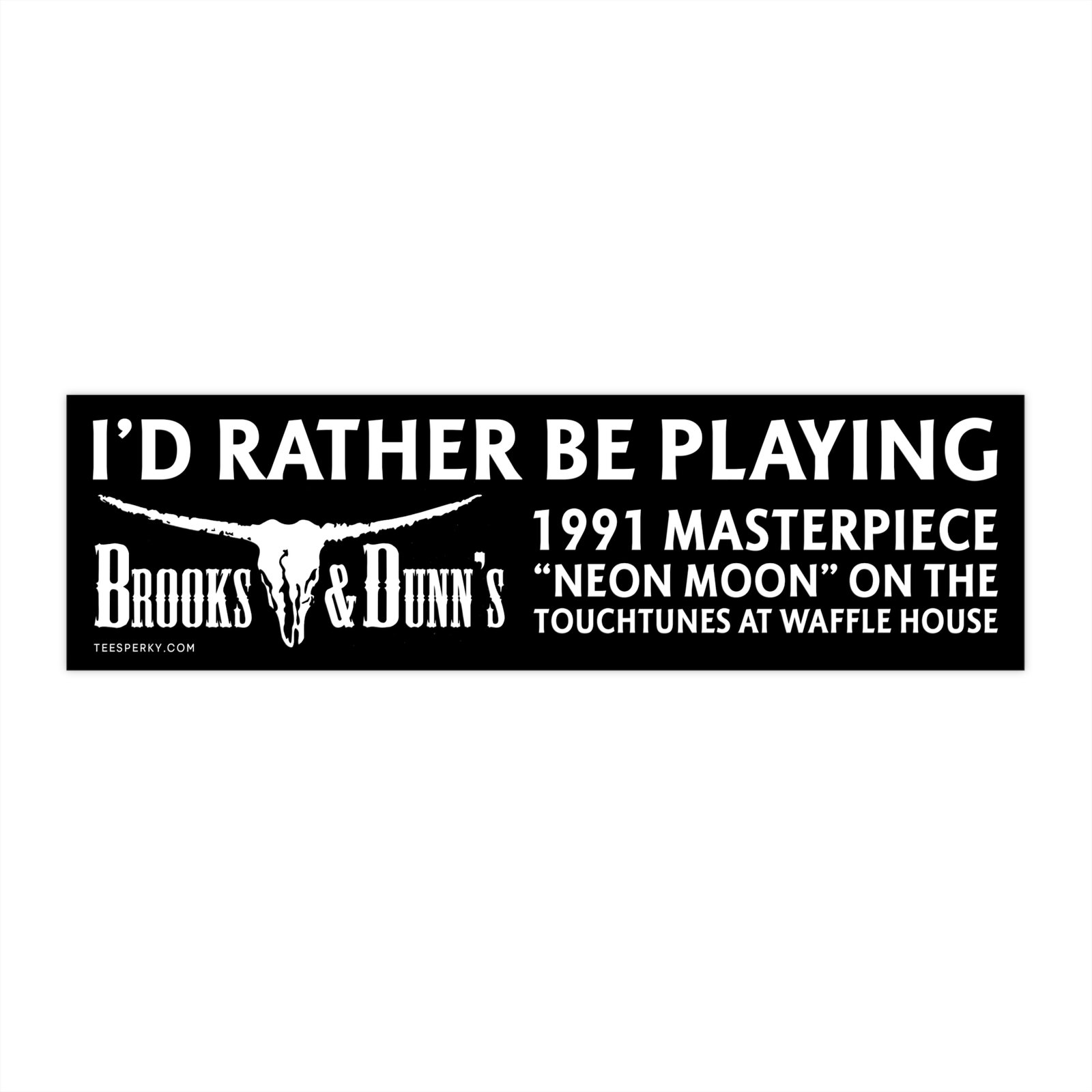 I’d Rather Be Playing Brooks & Dunn’s 1991 masterpiece “Neon Moon” on the Touchtunes at Waffle House—this bumper sticker is a nostalgic, country-loving tribute to late-night diners, iconic duets, and jukebox dreams. Perfect for fans of classic country and anyone who knows the magic of a Waffle House booth at midnight. Durable, waterproof, and made to spark smiles and sing-alongs.