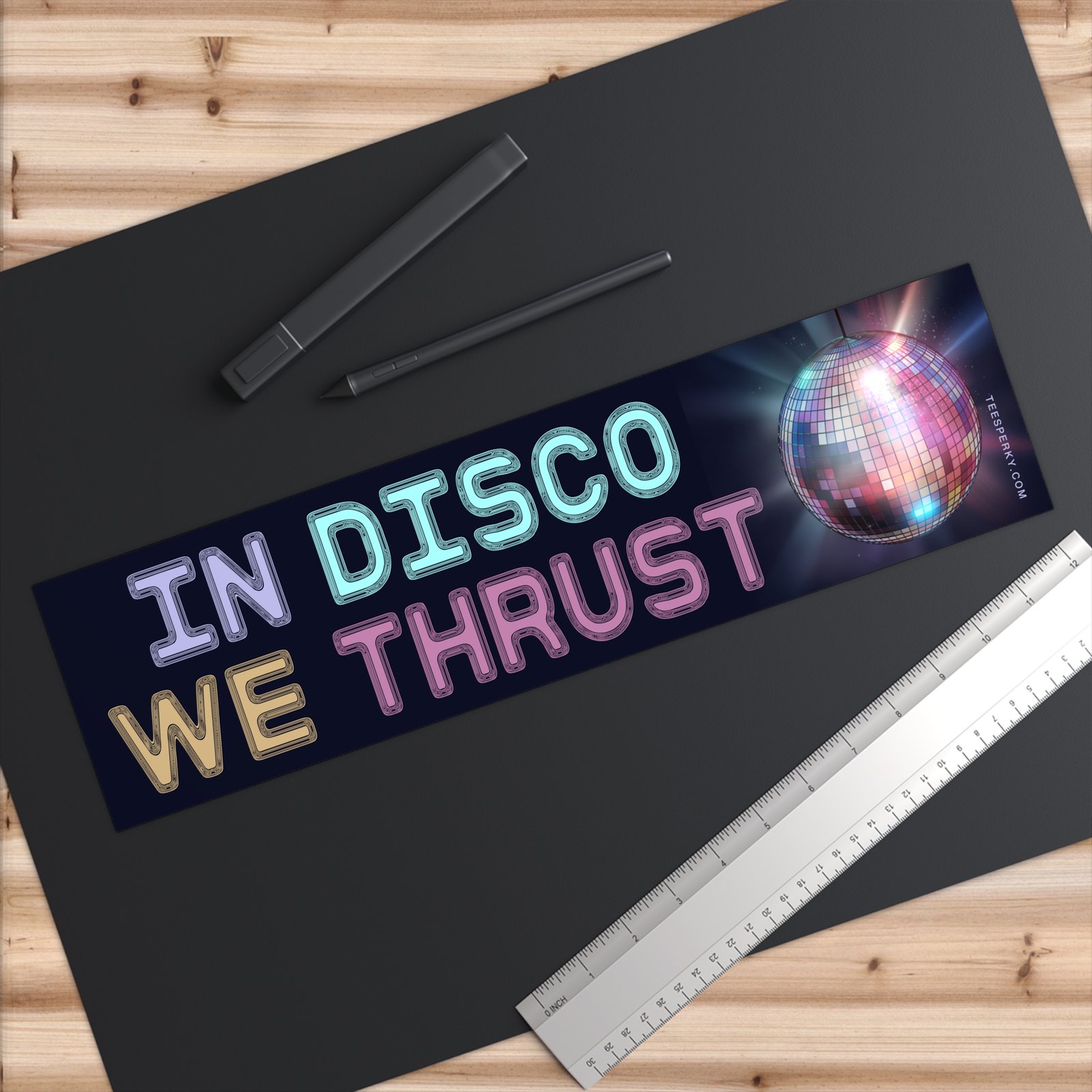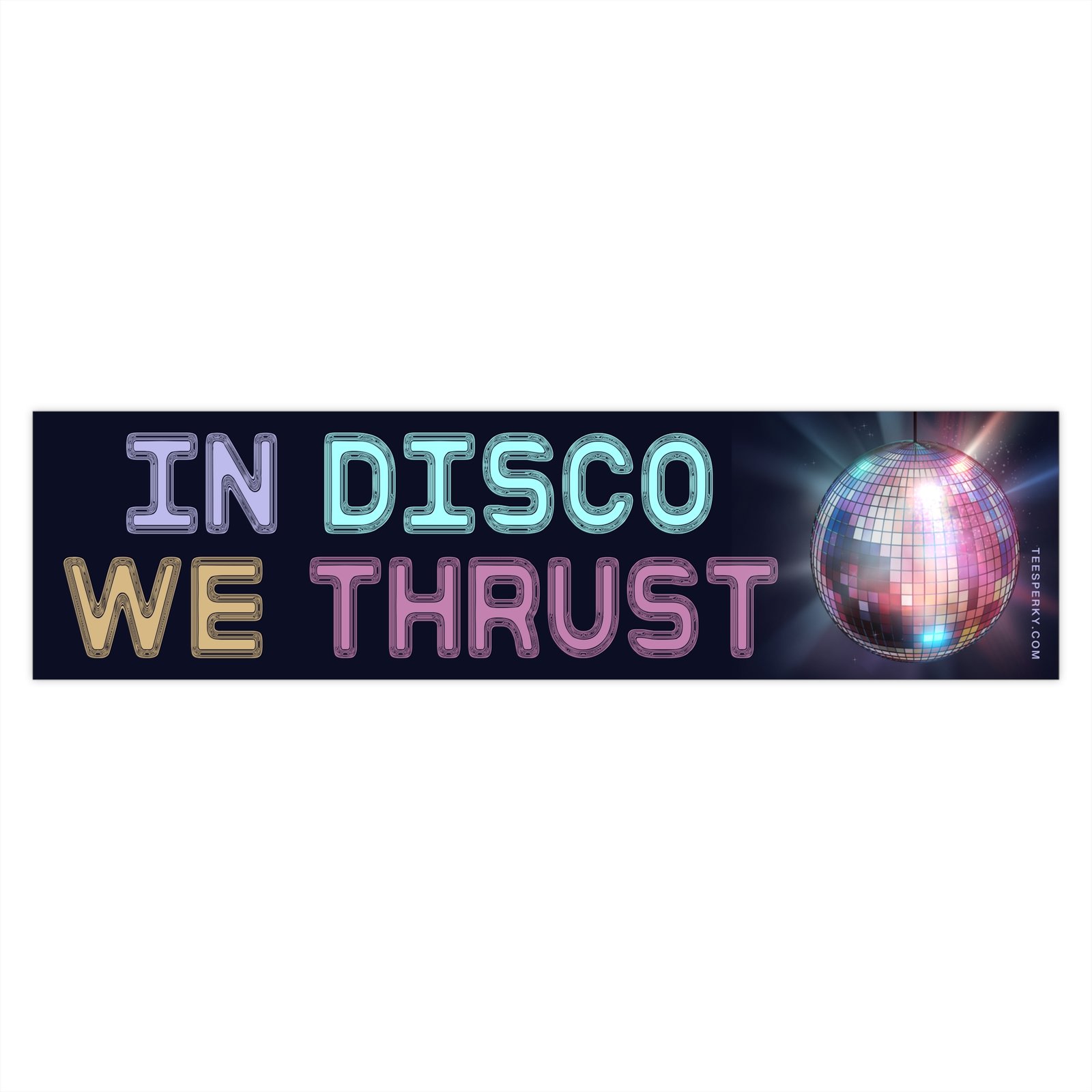 “In Disco We Thrust” bumper sticker is a bold, retro-inspired vinyl decal perfect for cars, laptops, and notebooks. Funky 70s disco humor for music lovers, dance enthusiasts, club goers, and fans of vintage style. Great gift for party people, festival fans, and anyone who loves disco jokes and funky designs. Waterproof, fade-resistant, and perfect for making a statement on the road or at the rave.