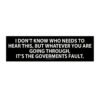 Spread some sharp humor with this “Whatever You’re Going Through, It’s the Government’s Fault” bumper sticker. A bold, funny political-style decal perfect for cars, laptops, and anyone who loves sarcastic commentary. Makes a great gift for humor lovers and truth-tellers!