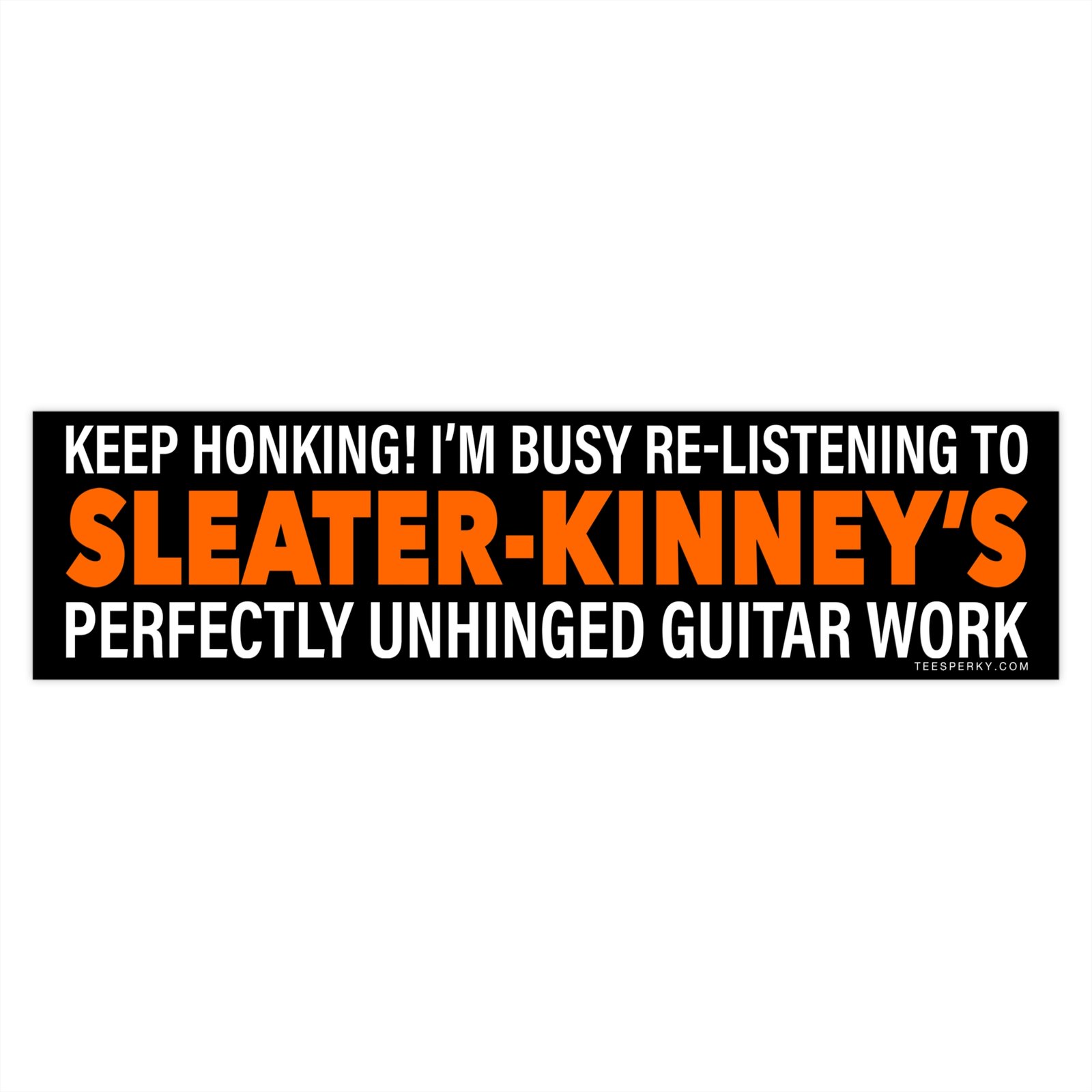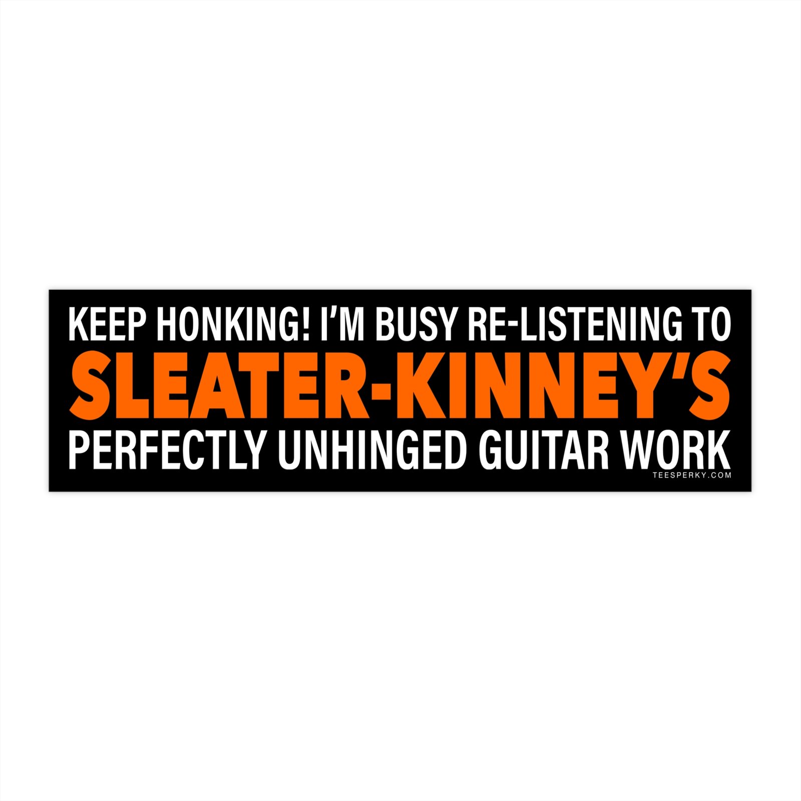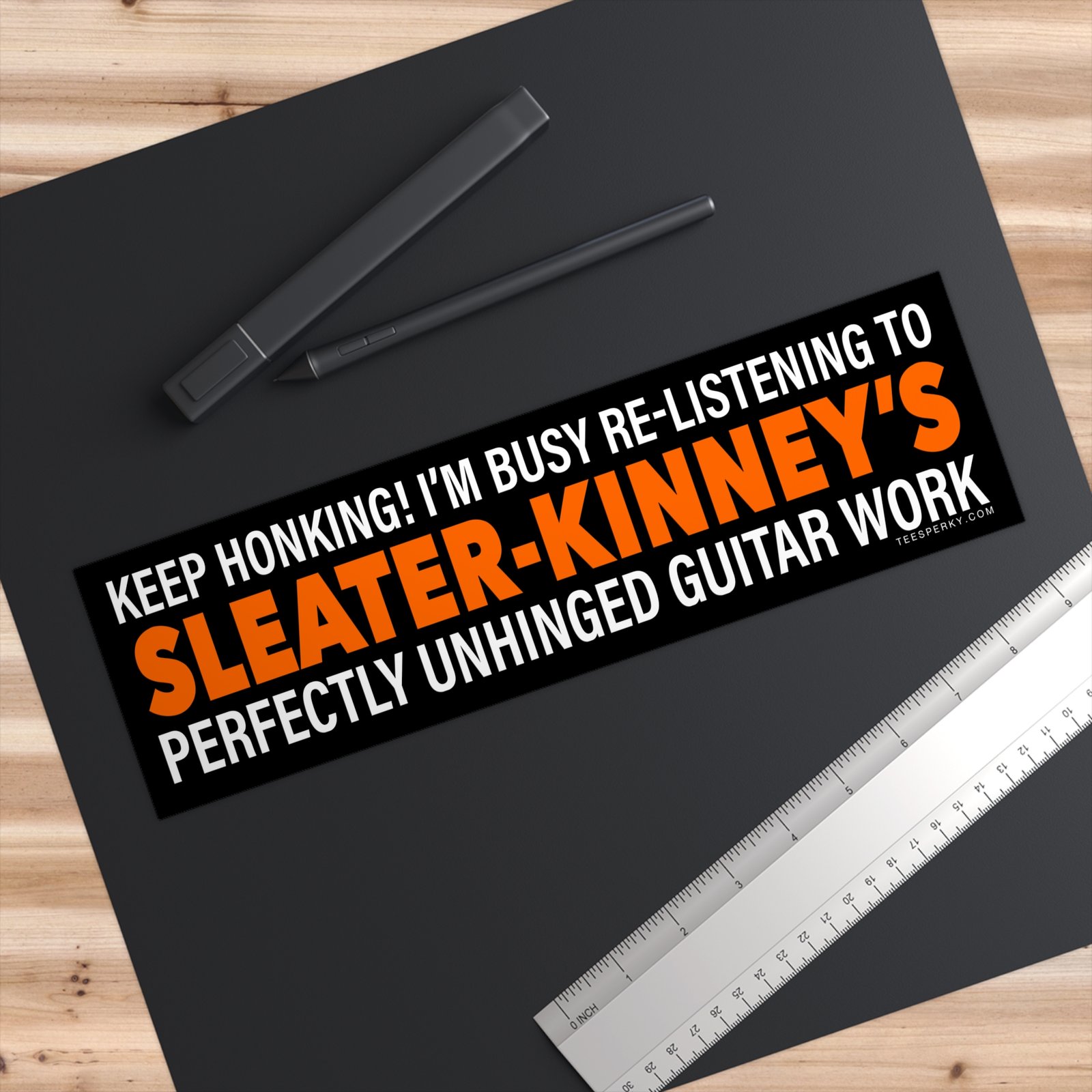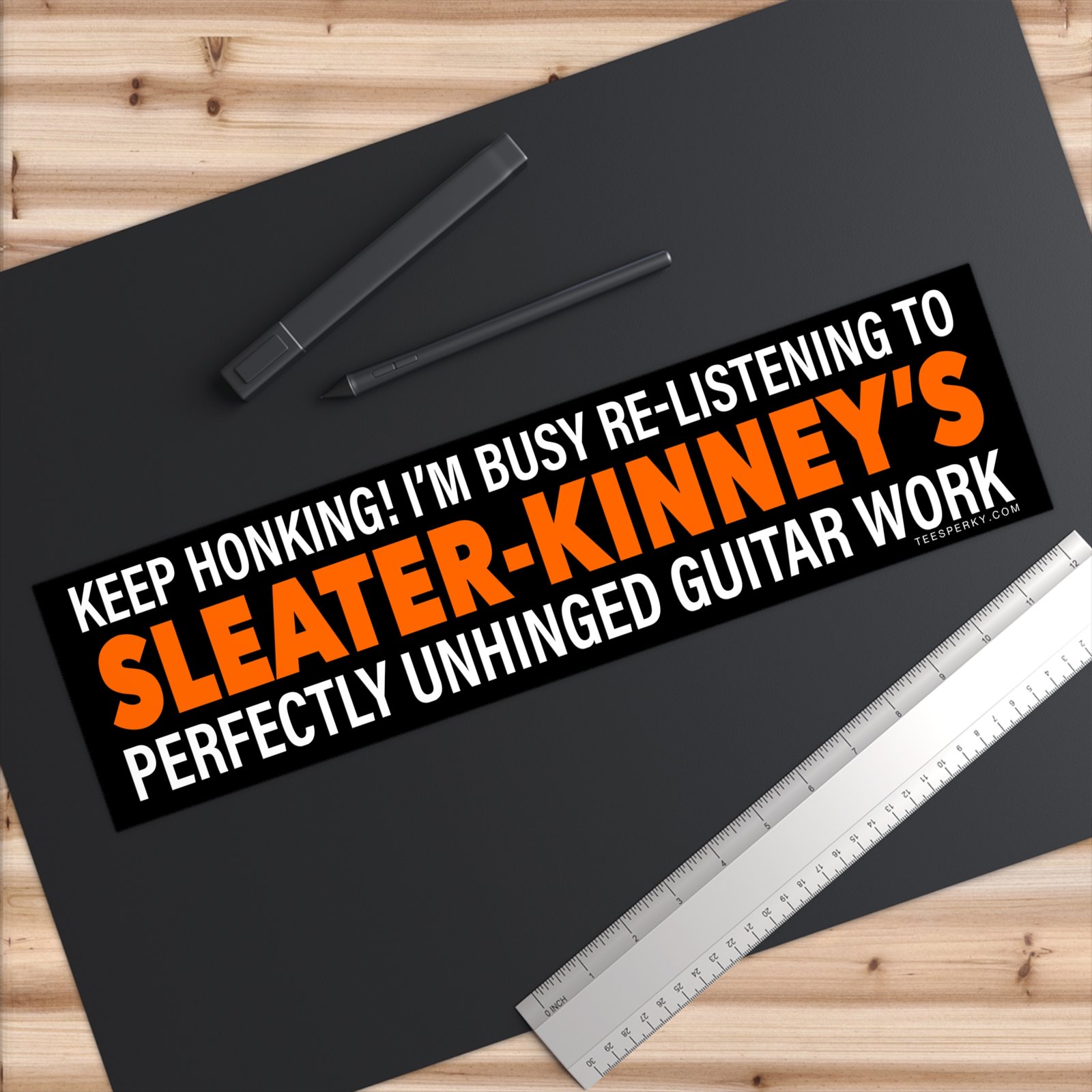 Funny bumper sticker for music lovers, Keep Honking I’m Busy Re-Listening to Sleater-Kinney, indie rock bumper sticker, riot grrrl humor, guitar music sticker, sarcastic car decal, band fan sticker, alternative rock humor, vinyl bumper sticker, road rage humor sticker, music quote sticker, rock fan car accessory, indie music decal, feminist punk rock sticker, witty bumper sticker, novelty gift for music fans, driver humor sticker, car sticker for musicians, loud guitar humor, iconic band sticker, music obsession sticker, vehicle decal, weatherproof vinyl sticker, funny warning sticker, ironic bumper sticker, concert lover gift, underground rock humor.