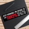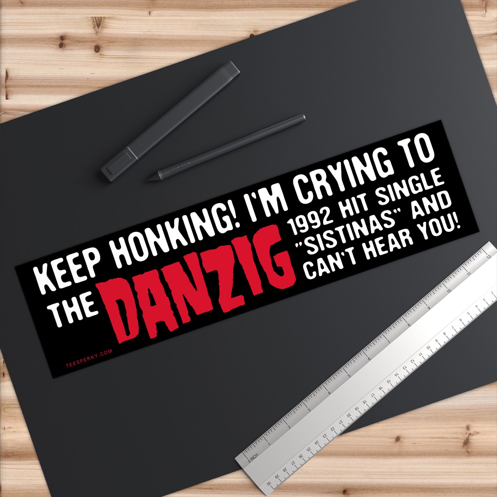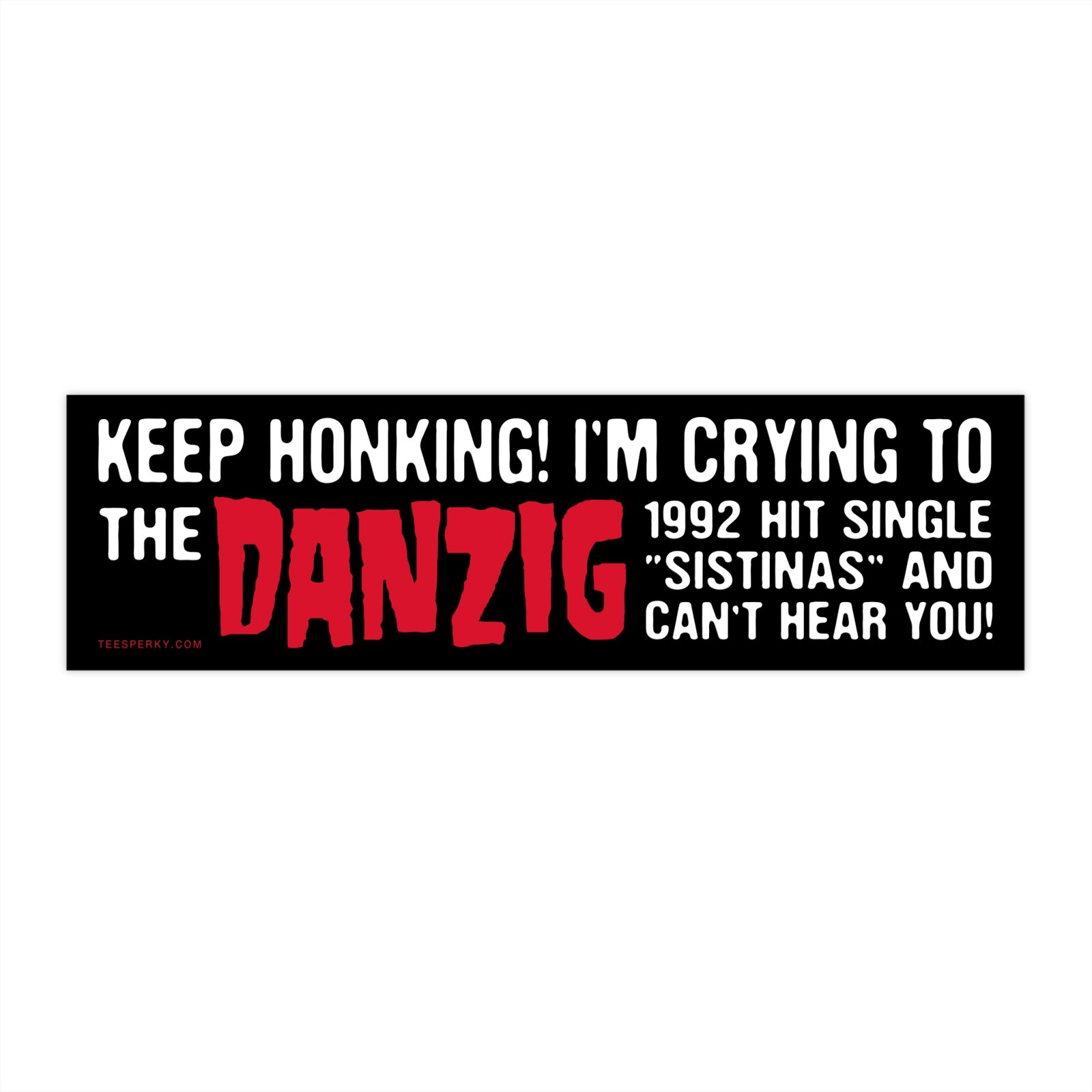 Funny “Keep Honking! I’m Crying to the Danzig 1992 Hit Single Sistinas” bumper sticker for cars, trucks, vans, and laptops. Perfect music humor decal for Danzig fans, rock lovers, and heavy metal enthusiasts. Durable vinyl car sticker makes a hilarious gift for concert goers, band merch collectors, and drivers with a sense of humor. Ideal novelty sticker for car windows, guitar cases, or any surface. Stand out on the road with this unique, rock-inspired bumper sticker that’s both funny and nostalgic for true 90s music fans.