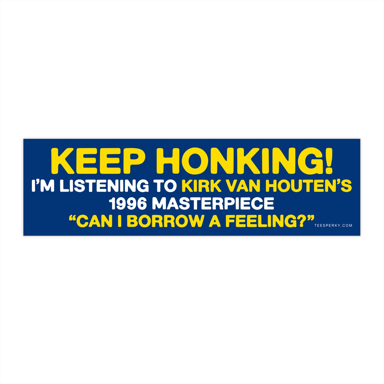 Show off your love for classic Simpsons humor with this “Keep Honking! I’m Listening to Kirk Van Houten’s 1996 masterpiece ‘Can I Borrow a Feeling?'” bumper sticker. Perfect for fans of Springfield’s most unforgettable divorce anthem and anyone who enjoys clever pop-culture car decals.