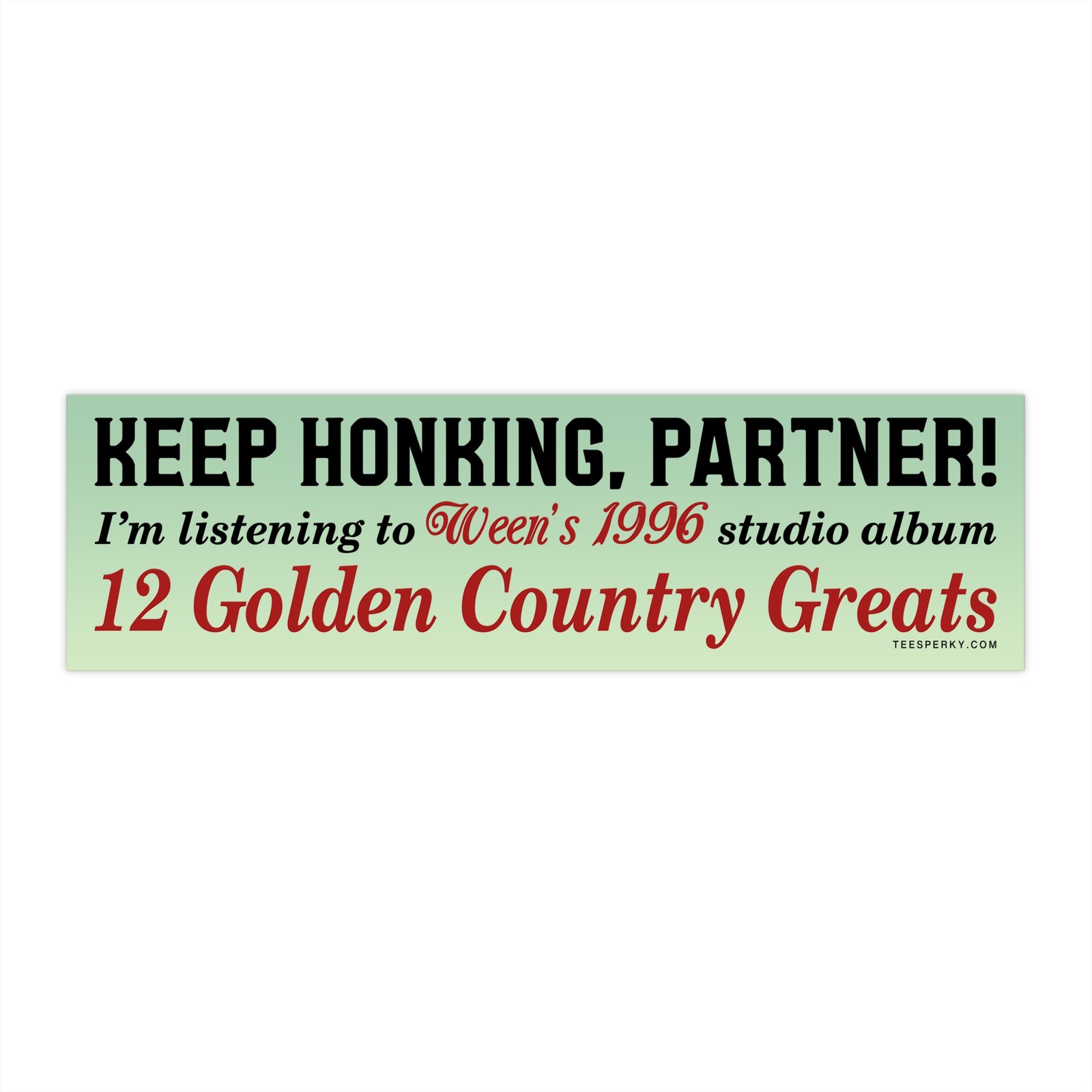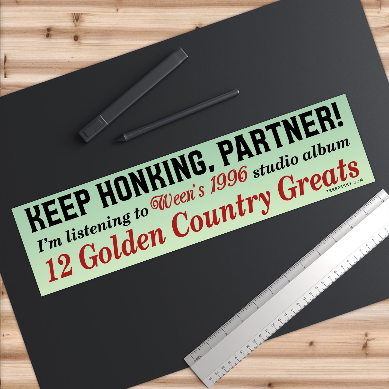 “Keep Honking, Partner! I’m Listening to Ween’s 1996 Studio Album 12 Golden Country Greats” bumper sticker is a perfect funny gift for Ween fans, country music lovers, or anyone who enjoys alt-rock humor. Great for cars, trucks, laptops, and instrument cases. This novelty sticker combines classic Ween lyrics with vintage country style. Durable, weatherproof vinyl decal designed for fans of Dean and Gene Ween, alternative country, tour merch collectors, and music memorabilia lovers. Makes a fun gift for band fans, music nerds, or anyone who loves weird bumper stickers.