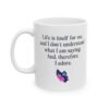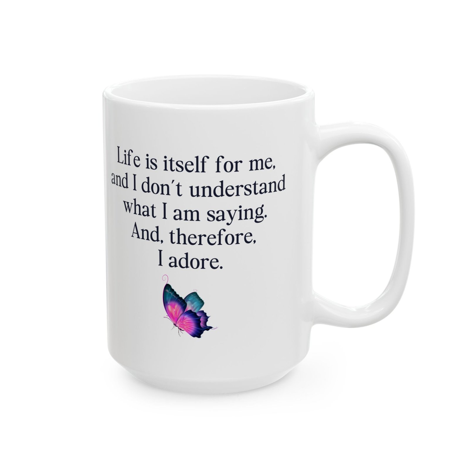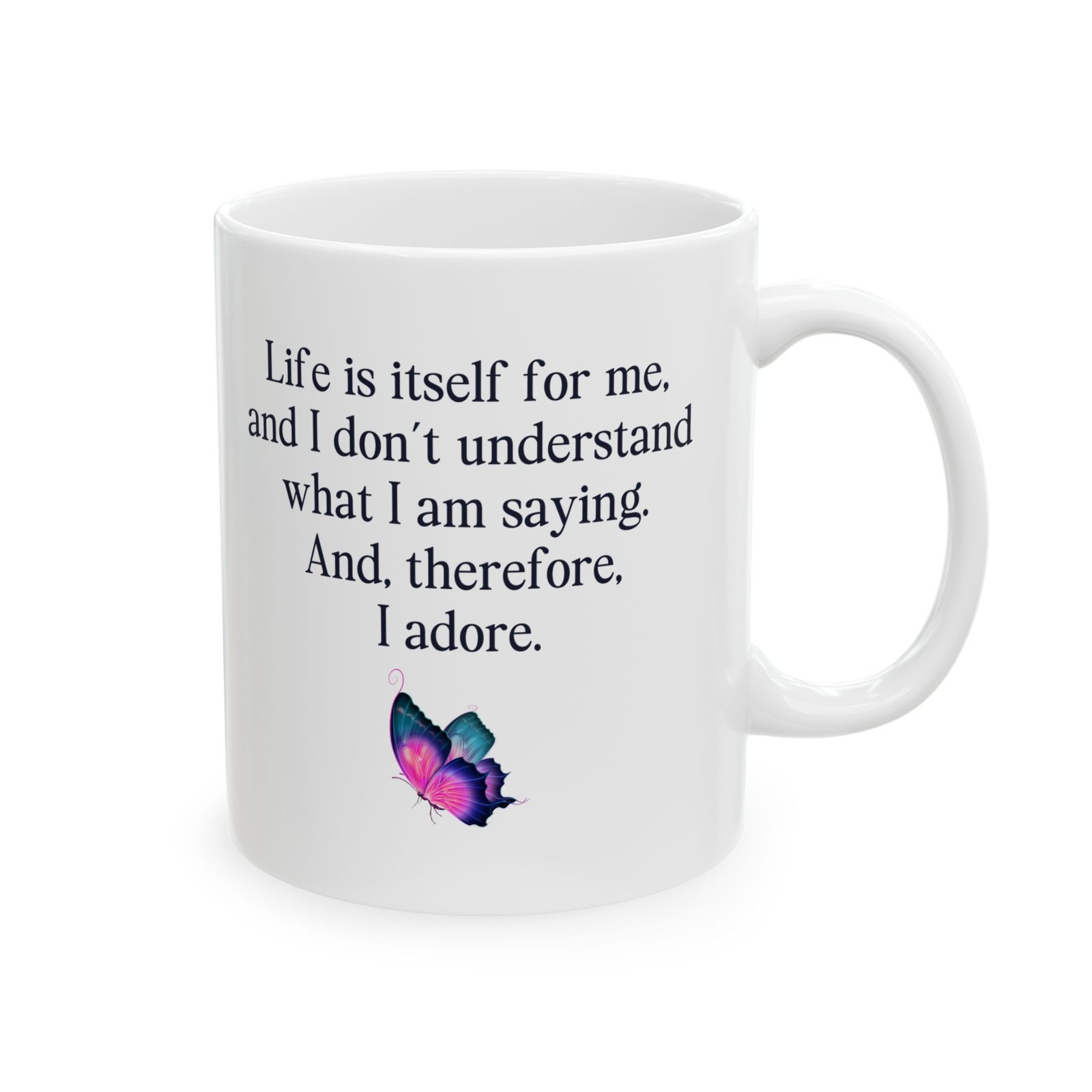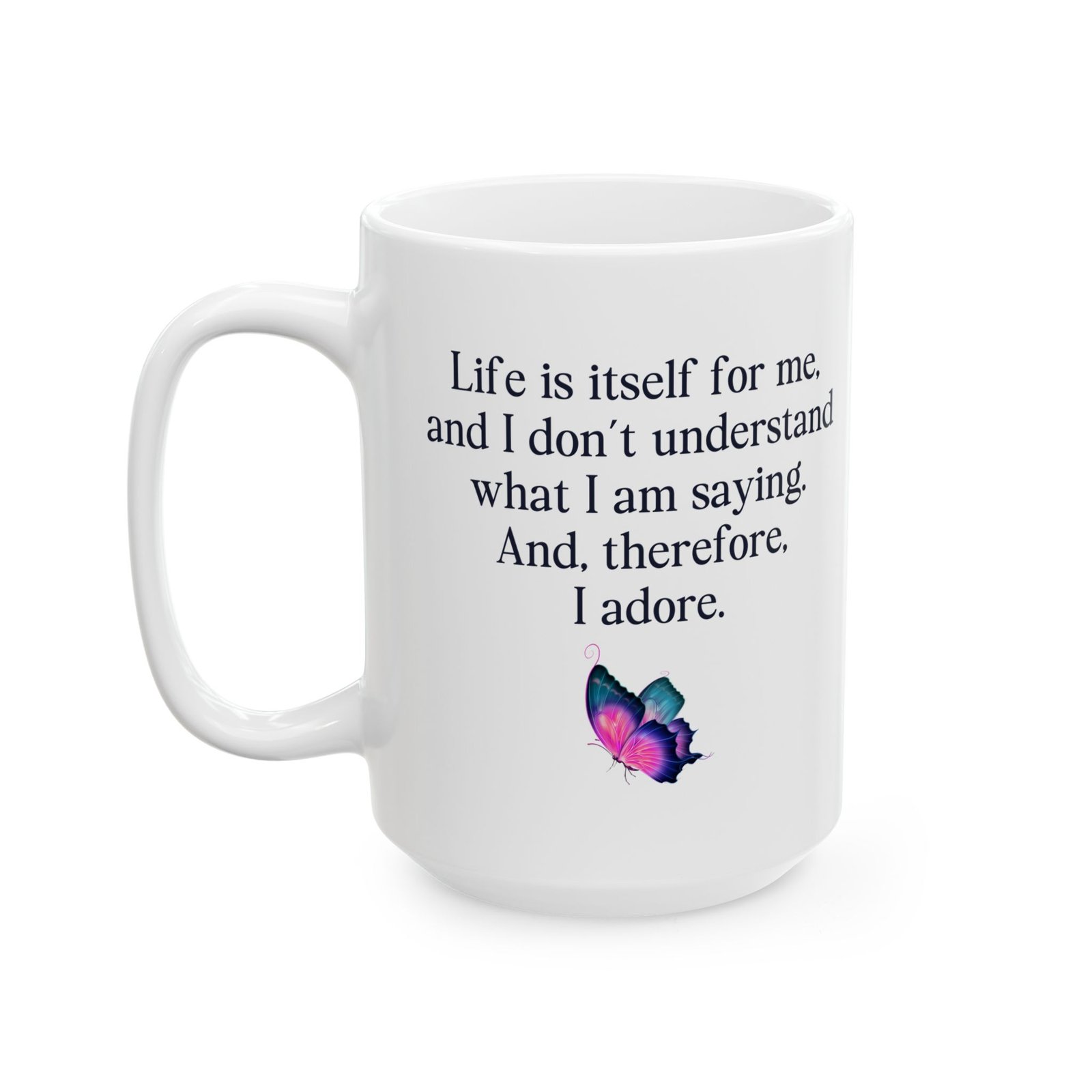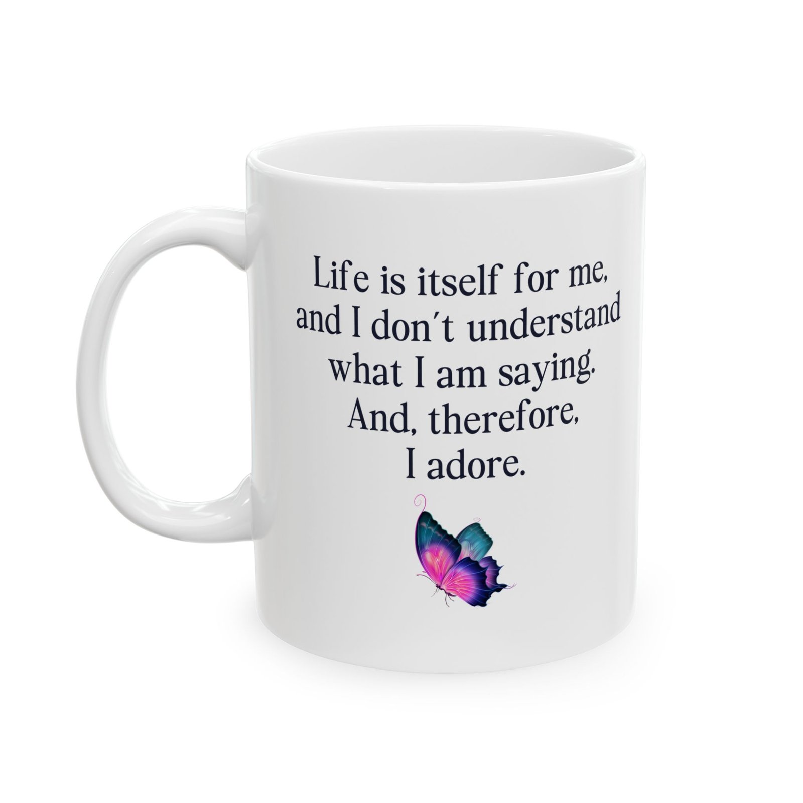 This unique mug features the quote “Life is itself for me and I don’t understand what I am saying and therefore I adore mug,” perfect for lovers of absurd humor, philosophical quotes, and ironic sayings. Ideal for coffee and tea drinkers who enjoy surreal, confusing, and thought-provoking humor. A great gift for writers, artists, overthinkers, and anyone who loves funny quote mugs, aesthetic mugs, and expressive drinkware. Perfect for home, office, or creative spaces.