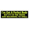 “I’ve Got a Perfect Body but It’s in the Trunk and Beginning to Smell” bumper sticker is a dark humor decal for cars, trucks, laptops, or toolboxes. Great for true crime fans, horror lovers, or pranksters who enjoy edgy, creepy, sarcastic humor. Durable vinyl sticker that sticks easily to any surface—perfect for Halloween, mystery lovers, or people with a twisted sense of humor. Bold, funny, shocking design that gets attention on the road or in parking lots. Makes a weird and funny gift idea for the right kind of friend.