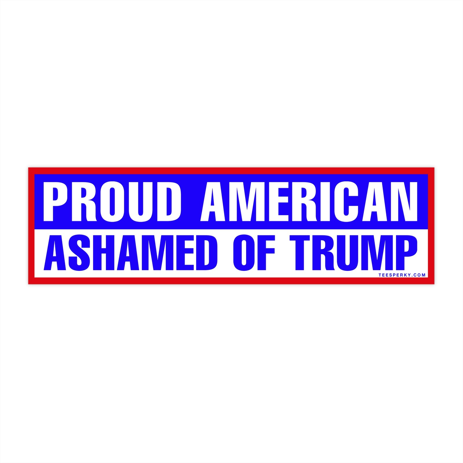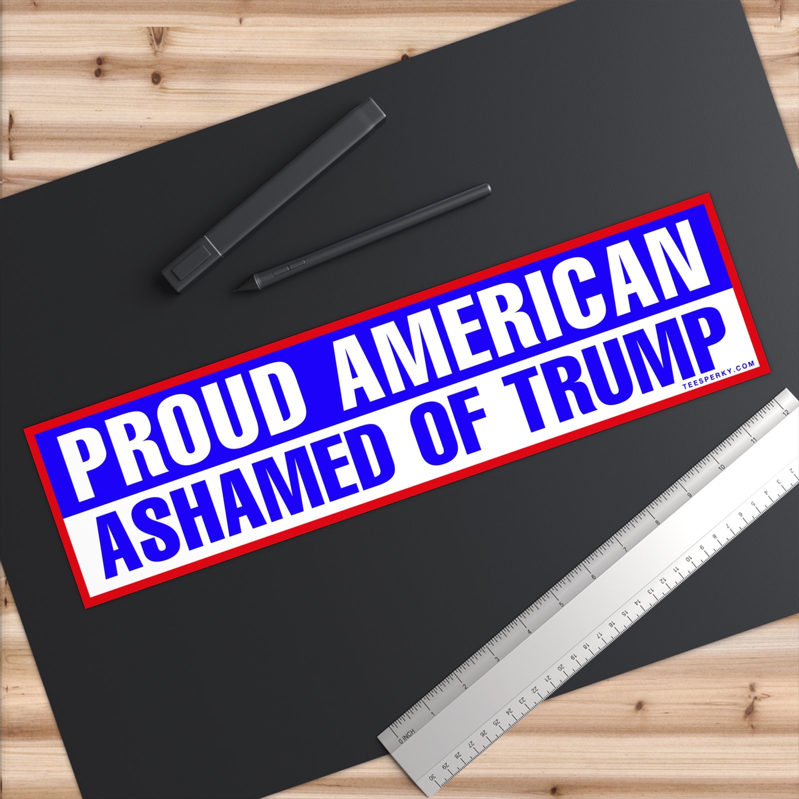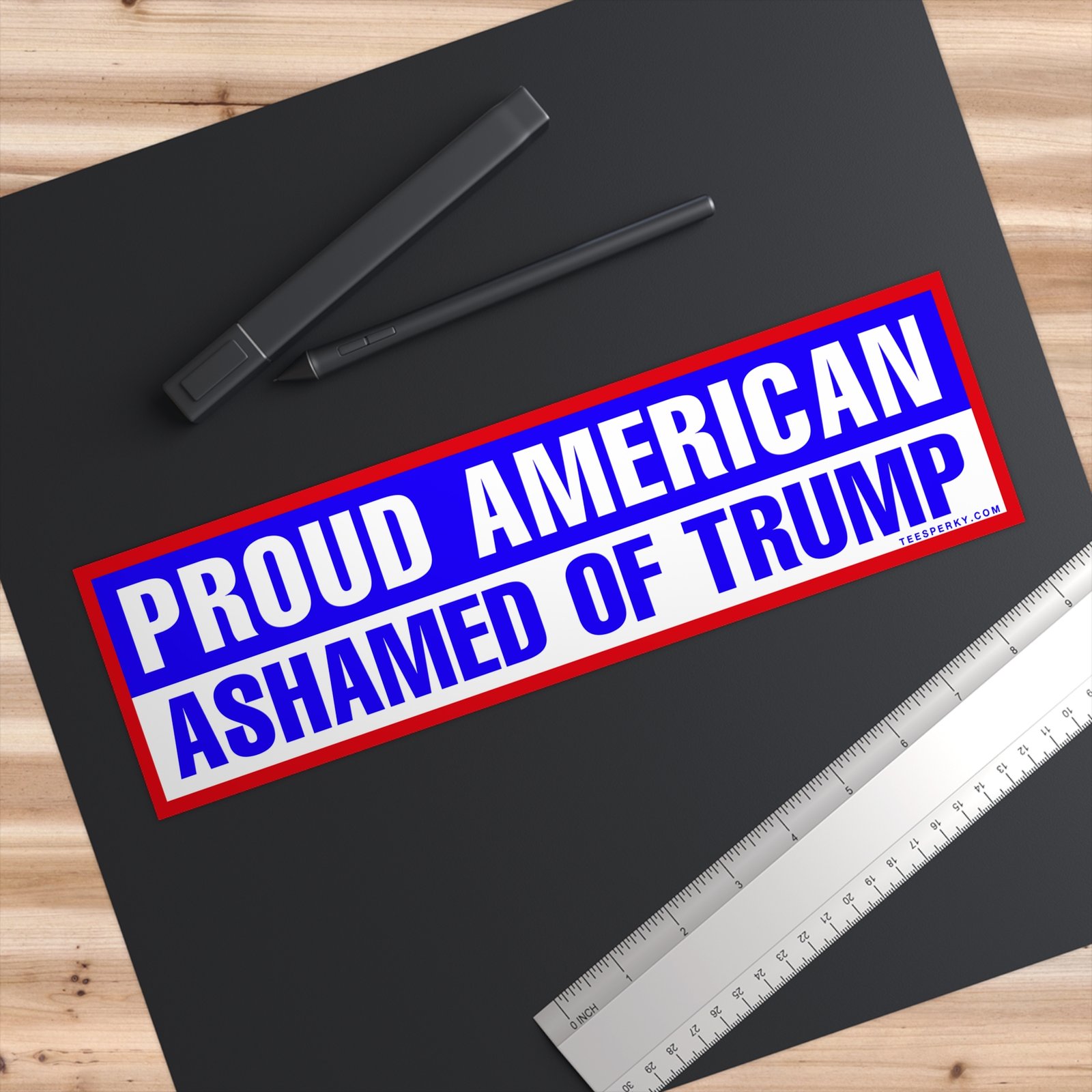 Proud American Ashamed of Trump bumper sticker, political bumper sticker, anti Trump sticker, political car decal, protest sticker, patriotic political sticker, liberal bumper sticker, progressive car sticker, election sticker, political statement decal, vinyl bumper sticker, resistance sticker, activist sticker, freedom of speech sticker, USA political sticker, democracy sticker, anti MAGA sticker, political humor sticker, bold statement sticker, car protest decal, political gift, activist gift, campaign sticker, social justice sticker, American values sticker, outspoken bumper sticker, weatherproof vinyl decal, durable car sticker, political expression sticker, protest car accessory.