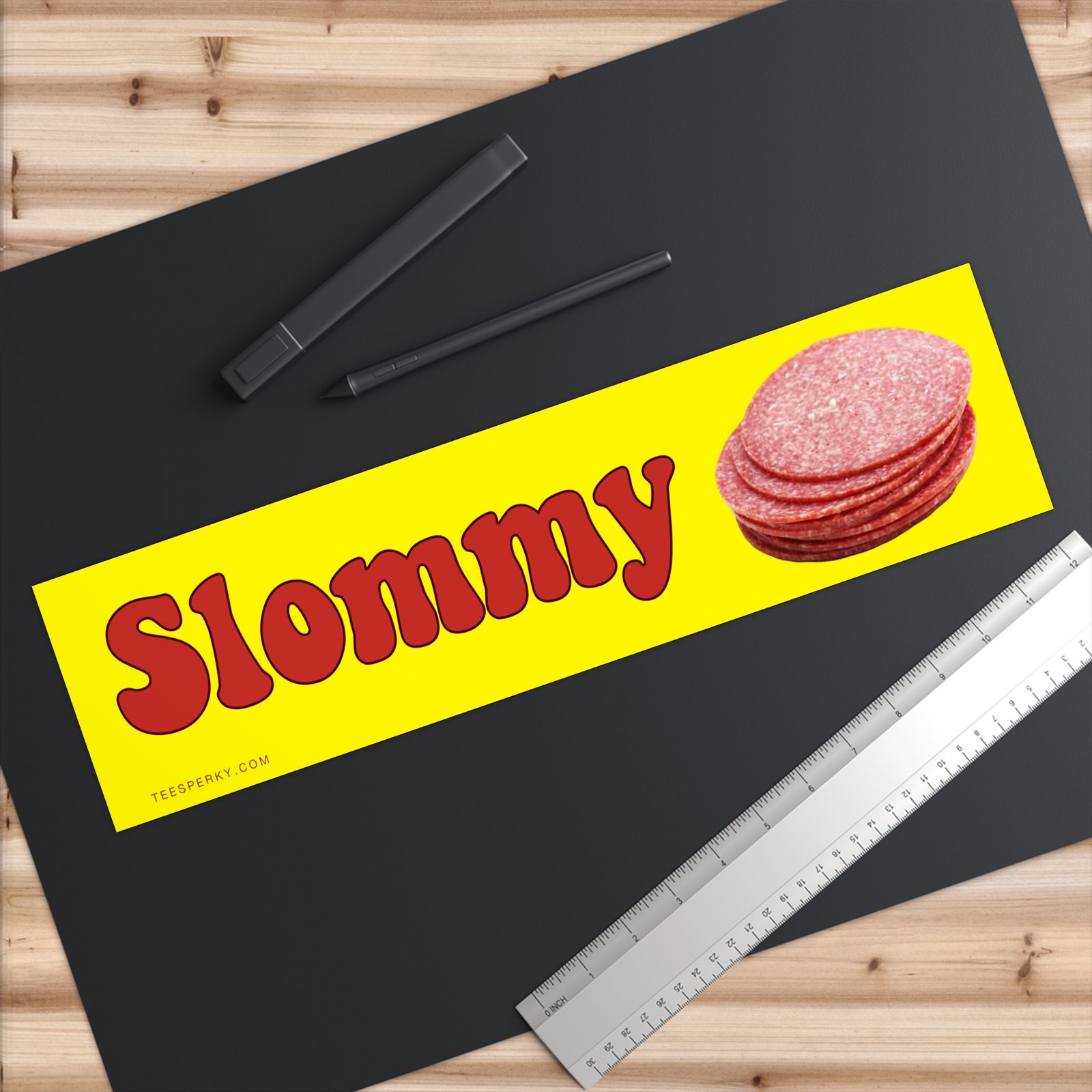 Add humor to your ride with the Slommy Salami bumper sticker featuring salami and pepperoni sausage slices. Perfect for food lovers, meat fans, deli enthusiasts, and anyone who loves funny food stickers. This high-quality vinyl bumper sticker is weatherproof, durable, and great for cars, laptops, coolers, water bottles, or kitchen decor. A fun gift for charcuterie lovers, pizza fans, sausage lovers, and food humor collectors.