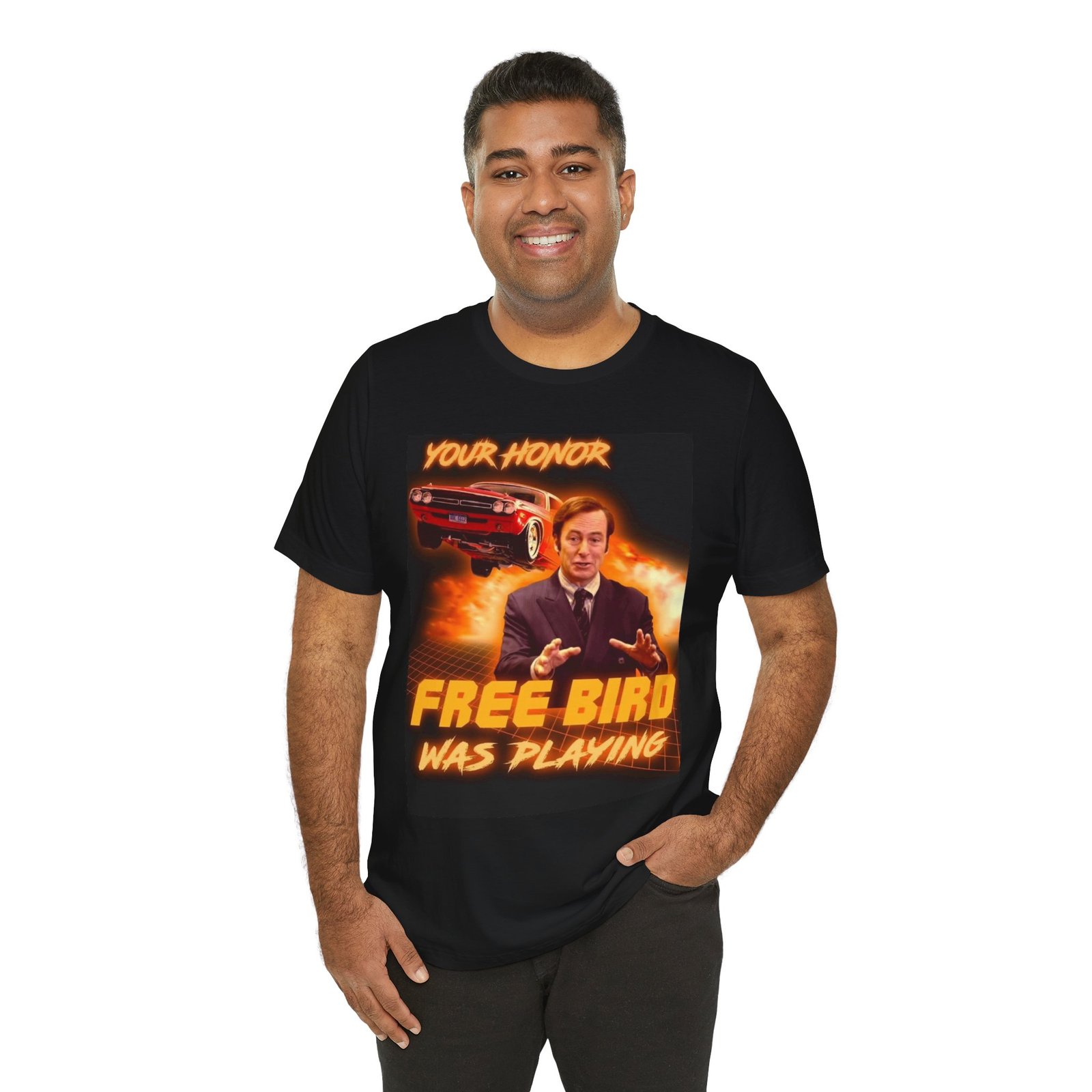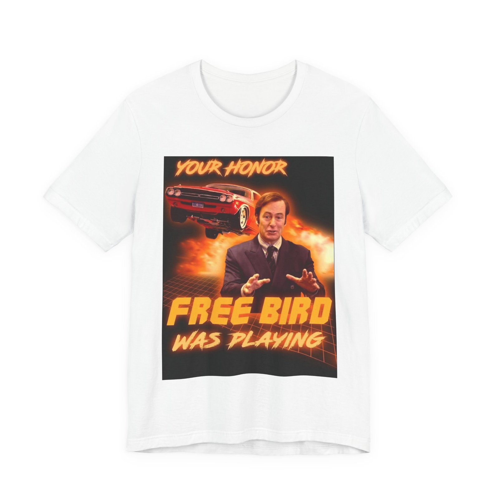 Make a bold, funny statement with the “Saul Goodman Your Honor Free Bird Was Playing” T-shirt, inspired by Saul Goodman from Better Call Saul and Breaking Bad. Perfect for fans of legal humor, courtroom jokes, and classic rock references. This graphic tee is ideal for TV show lovers, meme fans, and pop culture collectors who appreciate witty quotes and iconic characters. Great gift for lawyers, law students, rock music fans, and fans of Saul Goodman humor. Comfortable, stylish, and perfect for casual wear, conventions, or everyday outfits.