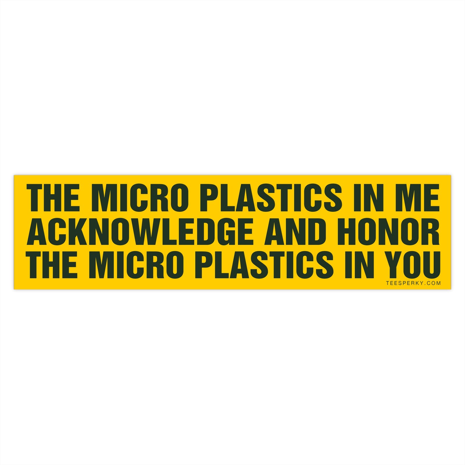 Make a bold environmental statement with The Micro Plastics in Me Acknowledge and Honor the Micro Plastics in You bumper sticker. A thought-provoking, ironic design highlighting microplastics, pollution awareness, environmental impact, and modern sustainability issues. Perfect for eco-conscious drivers, environmental activists, climate awareness supporters, and science humor fans. Durable, weatherproof vinyl sticker ideal for car bumpers, laptops, water bottles, notebooks, and urban street art style displays.