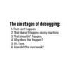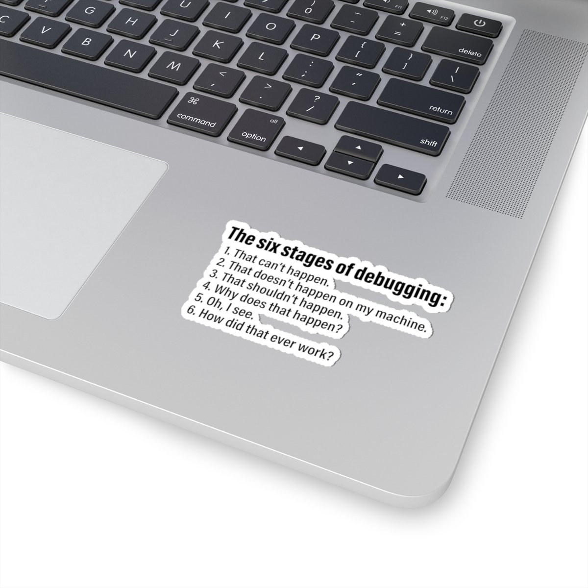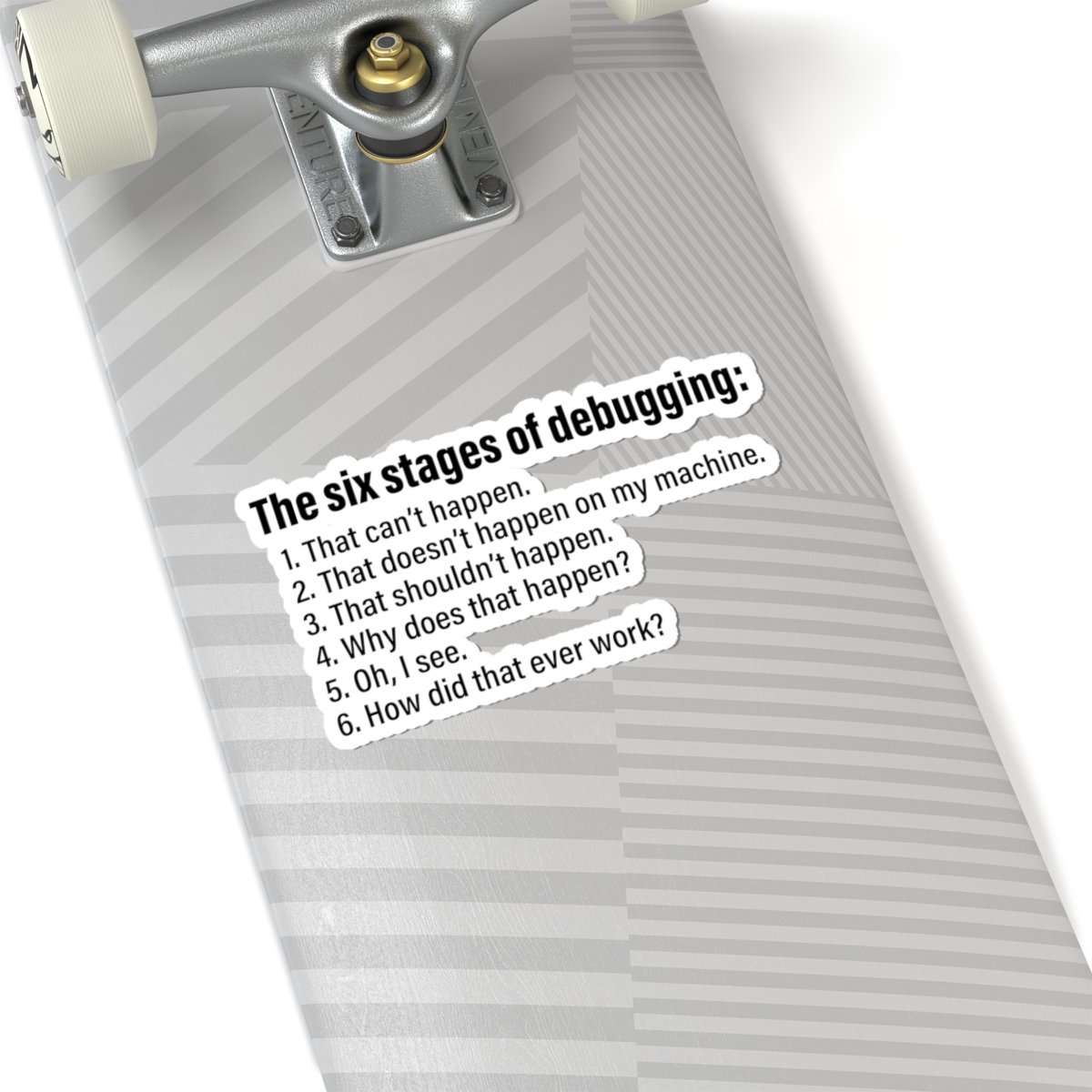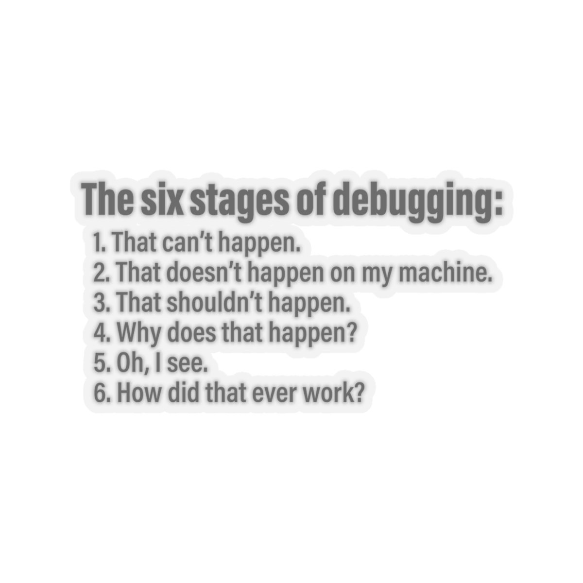 Celebrate developer humor with this “Six Stages of Debugging” sticker — a perfect gift for programmers, coders, and tech lovers. Featuring the classic debugging steps we all know too well, this funny decal is ideal for laptops, desks, water bottles, or dev workspace vibes.