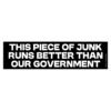 “This Piece of Junk Runs Better Than Our Government” bumper sticker is a bold political statement for your car, truck, SUV, or laptop. A sarcastic and funny government criticism sticker, perfect for expressing political frustration and anti-establishment humor. Durable vinyl decal designed for outdoor use, weatherproof, easy to apply and remove. Great gag gift, protest sticker, or conversation starter for patriots, libertarians, and anyone who enjoys anti-government jokes and political humor. Ideal for rallies, road trips, and freedom-loving drivers.