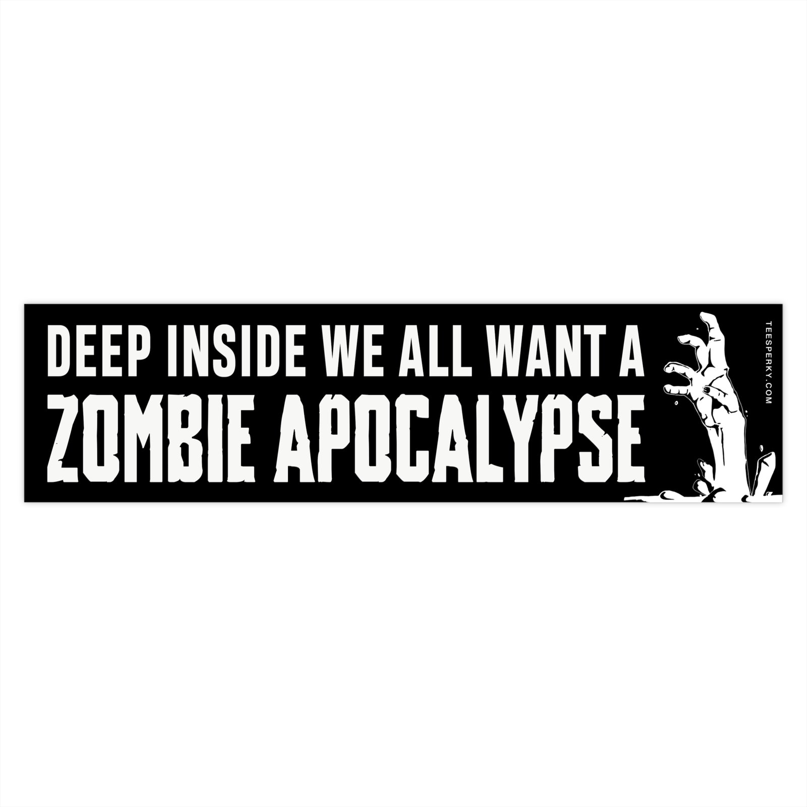 Funny “Deep Inside We All Want a Zombie Apocalypse” bumper sticker for horror fans, survivalists, and zombie lovers. Perfect for cars, trucks, laptops, water bottles, and notebooks. Durable vinyl decal features bold text and dark humor. Great gift for Halloween, apocalypse preppers, fans of zombie movies, The Walking Dead, and dystopian survival gear. Stick it anywhere to show your love for zombies, end-of-the-world scenarios, and creepy undead vibes. Makes people laugh, think, and prepare.