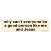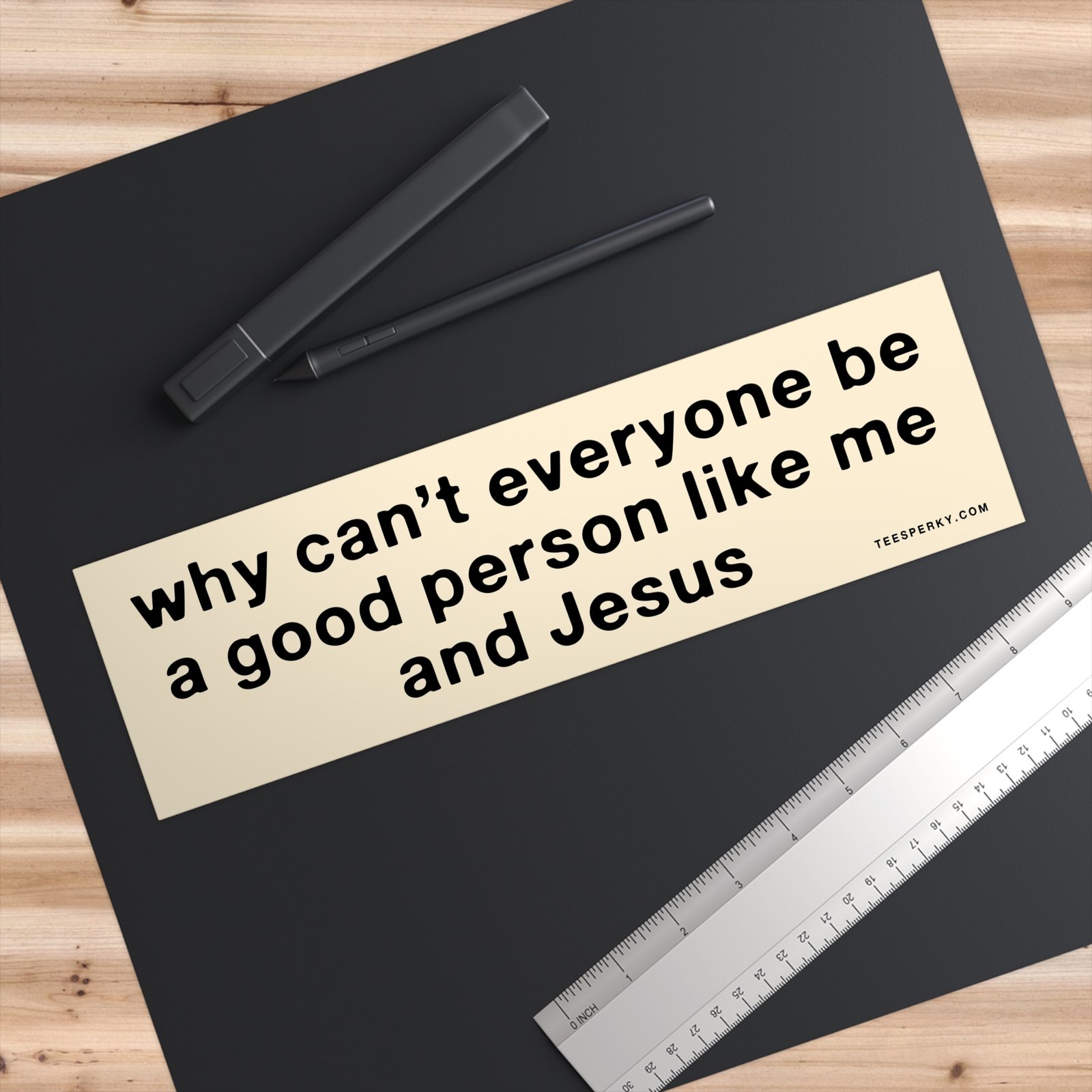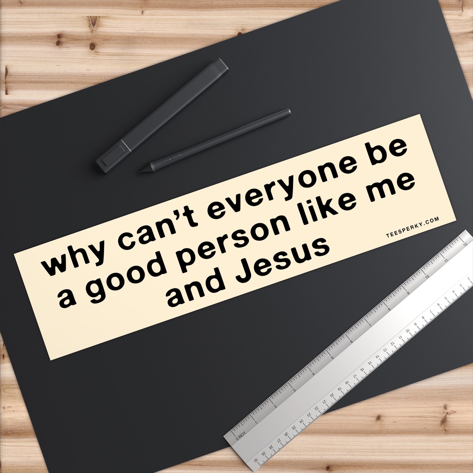 Make a bold, funny statement with this “Why Can’t Everyone Be a Good Person Like Me and Jesus” bumper sticker. Perfect for humor lovers, Christians with a sense of humor, and anyone who enjoys sarcastic faith-based quotes. This vinyl bumper sticker blends religion, irony, and wit, making it a great gift for church friends, believers, or fans of clever religious humor. Durable, weatherproof decal ideal for cars, laptops, water bottles, and more.